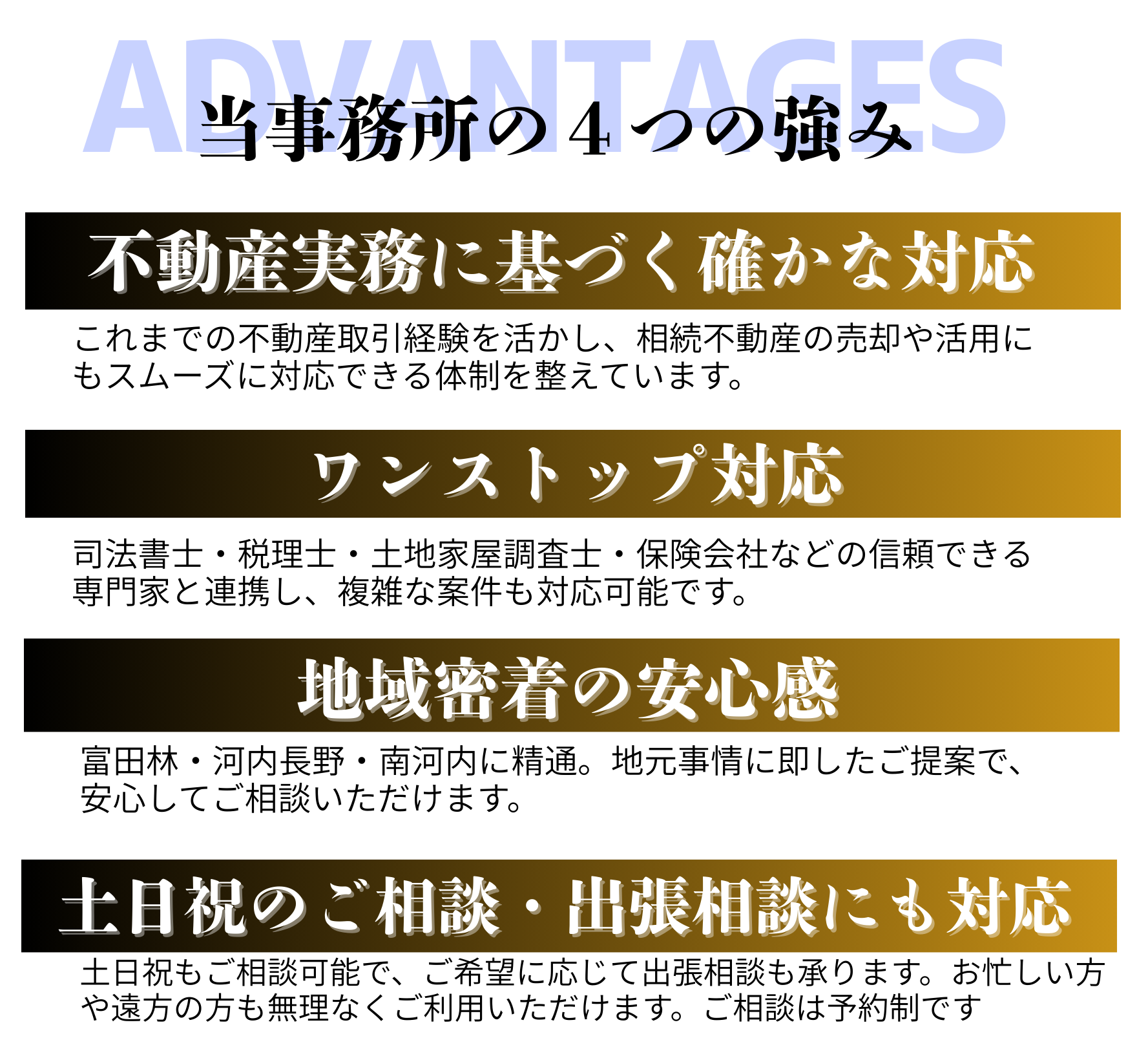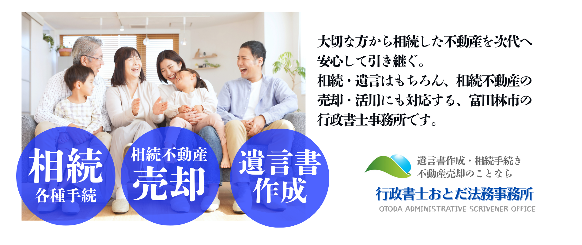 行政書士おとだ法務事務所では、行政書士×宅建士のダブルライセンスを活かし、相続手続きや遺言書作成を丁寧にサポートしています。富田林市・河内長野市・南河内郡を中心に、地域に根ざした安心の相談窓口としてご利用いただけます。また、不動産取引の知識を活かし、相続に伴う不動産の売却や活用のご相談もワンストップでサポートいたします。必要に応じて司法書士や他の専門家とも連携しながら、手続きがスムーズに進むようお手伝いします。初回相談は無料(予約制)ですので、平日お忙しい方や土日希望の方も安心してご相談いただけます。