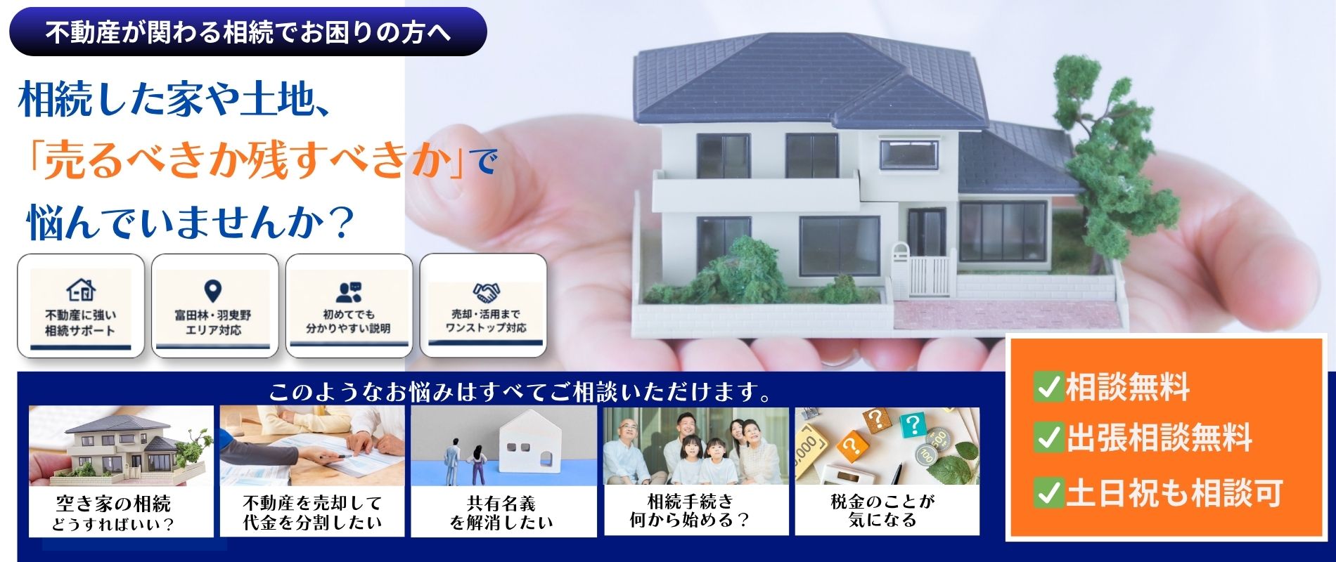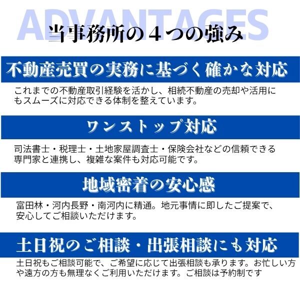 当事務所では、これまでの不動産取引の経験を活かし、相続不動産の売却や活用に関して、的確かつ安心なサポートを提供しています。司法書士や税理士、土地家屋調査士、保険会社などの専門家と連携し、複雑な手続きや調整も一括して対応可能です。地域の特性や市場動向にも精通しており、地元に根ざした適切なご提案を行います。